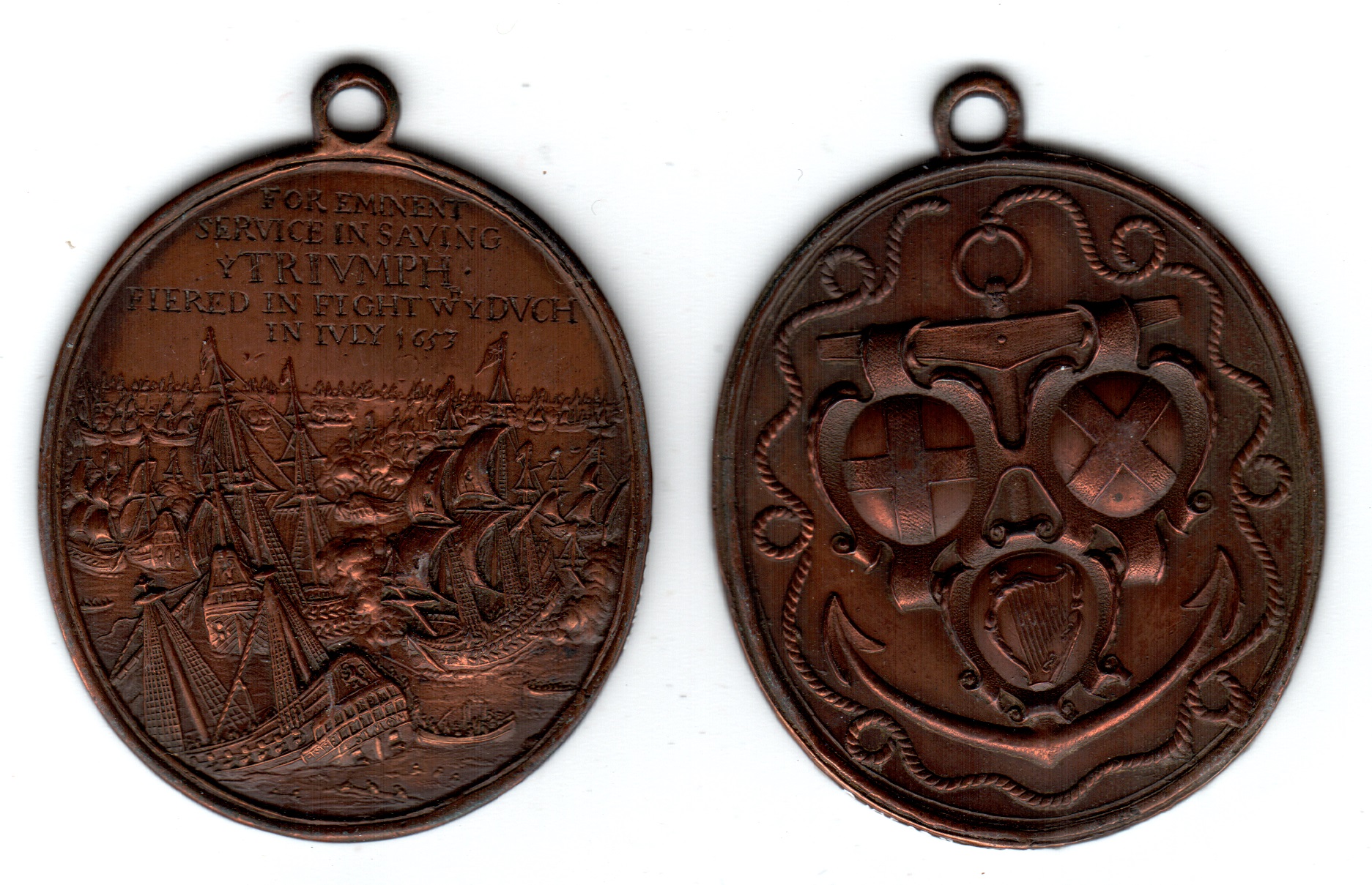 Triumph Medal 1653, 41 x 36mm., oval, uniface base metal electrotype cliches, obverse: anchor with three shields, encompassed by anchor cable, without a border; reverse: a naval action, with inscription, ‘For eminent service in saving y Trivmph fiered in fight wh y Dvtch in Ivly 1653’, without a border, with integral suspension ring, each with edge bearing a catalogue number in ink, respectively: ‘C-18507-B’ and ‘C-18507-A’, ref. Mayo No. 38, B.B.&M No. 14, M.H. No. 37 .